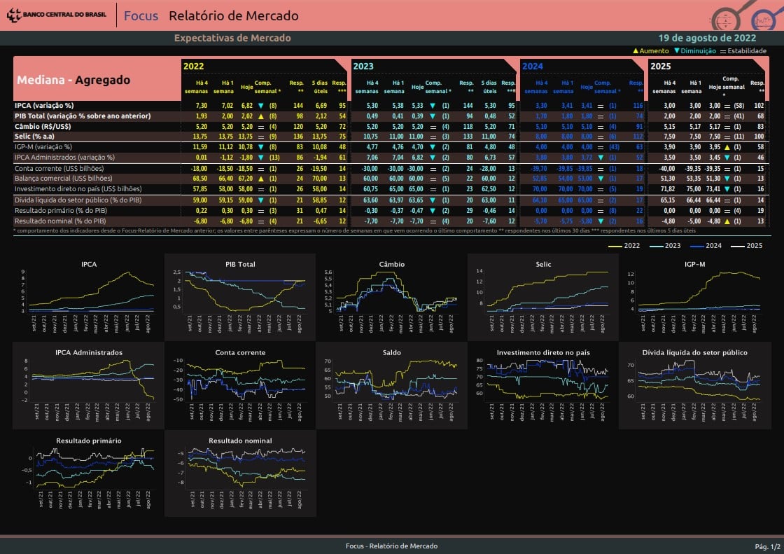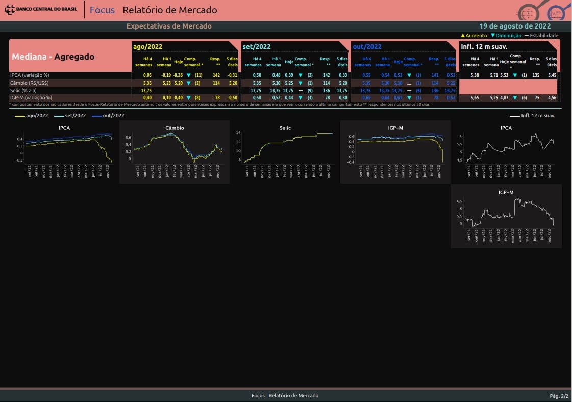 O Boletim Focus, divulgado pelo Banco Central do Brasil nesta segunda-feira (22/08), indica melhorias nas expectativas do mercado para a inflação e para a atividade econômica (PIB) em 2022. As expectativas para a inflação estão apresentando reduções desde o início de agosto, muito em decorrência das medidas de limitação do ICMS de combustíveis e energia elétrica. O mercado espera que o IPCA, indicador oficial de inflação no Brasil, encerre o ano em 6,82% (linha vermelha no gráfico). Há uma semana essa expectativa era de 7,02% e, há 4 semanas, 7,30%. Para 2023 (linha azul), porém, o mercado passa a crer em uma taxa de inflação cada vez mais acima da meta, em 5,33%.
